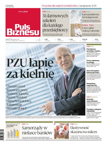 PZU łapie za kielnię – ubezpieczyciel kierowany przez Andrzeja Klesyka tworzy fundusz nieruchomościowy, w który zaiwnestuje 500 milionów złotych; 31 darmowych szkoleń dla każdego przedsiębiorcy; karta podatkowa bez księgowości; łowcy głów walczą o zlecenia; PetrolInvest sprzedaje segment sprzedaży gazu płynnego, którym zainteresowany jest Gaspol; firmy zakładamy na potęgę – w 2011 roku przybyło 24,3 tysiąca firm; Anna Streżyńska wg konkurencji faworyzuje Playa; samorządy w niełasce banków; ekożywność skazana na sukces.