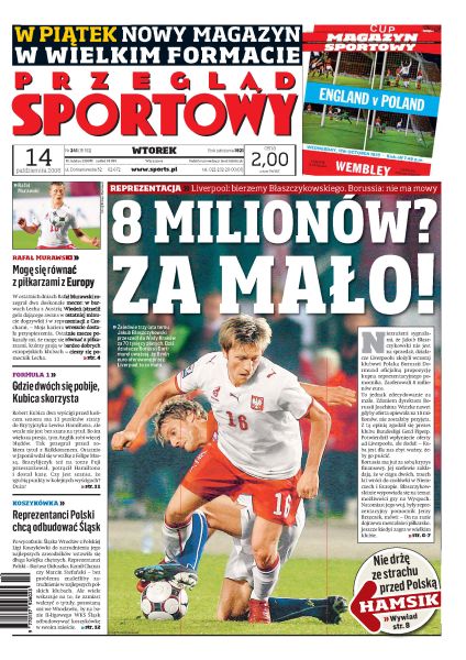 Przed meczem ze Słowacją polscy piłkarze zapewniają, że wygrana z Czechami rozpoczęła nowy rozdział w historii naszej kadry; wywiad z Rafałem Murawskim; Liverpool chce zapłacić za Jakuba Błaszczykowskiego 8 milionów euro, ale dla Borussii to za mało; rozmowa z Markiem Hamsikiem, piłkarzem reprezentacji Słowacji; aby wygrać rywalizację o tytuł mistrz świata, Robert Kubica potrzebuje dużo szczęścia, a na poprawienie bolidu jest już za późno; w sobotą startuje liga koszykówki kobiet; Michał Jurecki nie został powołany do kadry z powodu kontuzji, która nie przeszkadza mu rzucać po kilka goli na mecz w rozgrywkach ligowych.