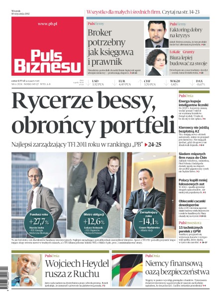 Rycerze bessy, obrońcy portfeli – najlepsi zarządzający TFI 2011 roku w rankingu Pulsu; broker potrzebny jak księgowa i prawnik; faktoring dobry na kryzys; biura lepiej budować za swoje – deweloperom coraz trudniej o kredyt; Wojciech Heydel rusza z Ruchu; Niemcy finansową oazą bezpieczeństwa; Energa kupuje inteligentne liczniki; kierowcy nie jeżdzą bezpłatną A2; siedem mięsnych firm rusza do Chin; Polacy kupili mniej luksusowych aut; obiecanki cacanki deweloperów; 15 technicznych perełek z GPW.