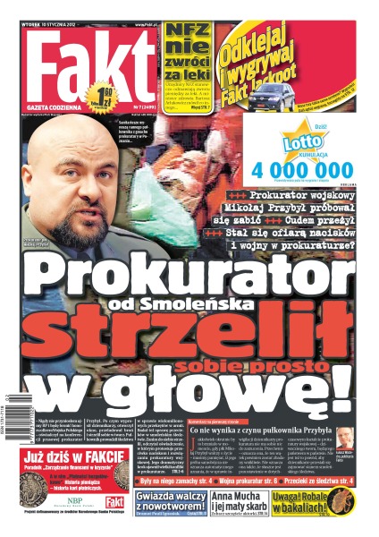 Prokurator od Smoleńska strzelił sobie prosto w głowę – prokurator wojskowy Mikołaj Przybył próbówał się zabić, cudem przeżył, czy stał się ofiarą nacisków i wojny w prokuraturze; dramat Pauli Ignasiak – gwiazda walczy z nowotworem; Anna Mucha i jej mały skarb – zobacz szczęście aktorki; uwaga na robale w bakaliach; NFZ nie zwróci za leki – urzędnicy NFZ stanowczo odmawiają zwrotu pieniędzy za leki, a minister zdrowia Bartosz Arłukowicz mówił przecież co innego.
