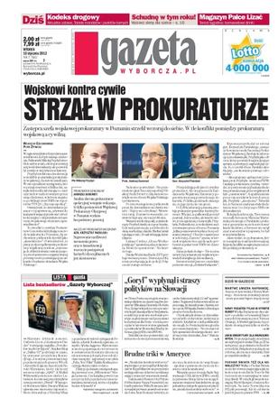 Strzał w prokuraturze – wojsko kontra cywile – zastępca szefa wojskowej prokuratury w Poznaniu strzelił wczoraj do siebie – w tle konflikt pomiędzy prokuraturą wojskową a cywilną; „Goryl” wypłynął i straszy polityków na Słowacji; brudne triki w Ameryce; lista bestsellerów „Gazety Wyborczej”; schudnę w tym roku – wybierz dietę dla siebie; Martwe umiera naprawdę – jeszcze w tym wieku z Morza Martwego może powstać bajoro żrącej cieczy; czy nowy podatek będzie tylko w strefie Euro; jakie emerytury dla mundurowych; czy Justyna Kowalczyk zdobędzie także Puchar Świata.