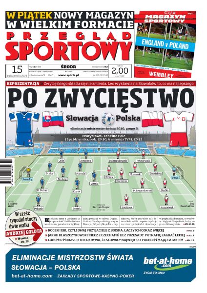 Dziś Polska zagra ze Słowacją, Leo Beenhakker wystawia najsilniejszy skład; wywiad z Jakubem Błaszczykowskim; rozmowa z Markiem Mintalem, pomocnikiem reprezentacji Słowacji; trudna sytuacja Czech w grupie eliminacyjnej do MŚ 2010; w Pucharze Ekstraklasy piłkarze Legii pokonali na własnym stadionie Polonię 4:0; jeżeli Andrzej Gołota wygra dwie najbliższe walki, to spełni swoje marzenie - zostanie bokserskim mistrzem świata; Fernando Alonso uważa, że jego zespół dysponuje obecnie najlepszym paliwem w Formule 1; Krzysztof Kaliszewski zastąpi Piotra Zajcewa w roli trenera Skolimowskiej i Ziółkowskiego.
