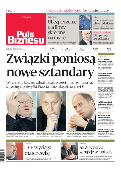 Związki poniosą nowe sztandary – wiosną strajków nie zabraknie, ale prezesi firm nie muszą się bać wojny o podwyżki – przeciwnikiem będzie rząd; ubezpieczenie dla firmy skrojone na miarę – o skuteczności polisy OC decydują detale – ubezpieczyciel nie zawsze o nich powie; pakiety medyczne tylko z podatkiem; CRM pomoże poznać klienta; kryzys mocno trzyma się płytek; Krzysztof Desler, były wiceprezes PKO BP, został doradcą; resort transportu przygotował bubla; HW Pietrzak kupi walcownię Mittala; TVP wyciąga marchewkę – zapłacisz abonament, obejrzysz wszystko za darmo w sieci; ABW wykryła korupcję w łupkach – Wiesław S., prezes spółki z grupy giełdowego Petrolinvestu, oraz urzędnicy resortu środowiska zostali zatrzymani przez śledczych.