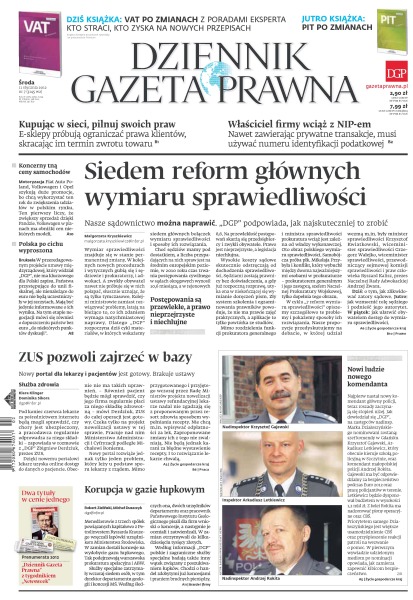 Siedem reform głównych wymiaru sprawiedliwości – nasze sądownictwo można naprawić – „DGP” podpowiada jak najskuteczniej to zrobić; ZUS pozwoli zajrzeć do bazy – nowy portal dla lekarzy i pacjentów jest gotowy; korupcja w gazie łupkowym; nowi ludzie nowego komendanta; koncerny tną ceny samochodów; kupując w sieci pilnuj swoich praw – e-sklepy próbują ograniczać prawa klientów, skracając im termin zwrotu towaru; właściciel firmy wciąż z NIP-em – nawet zawierając prywatne transakcje, musi używać numeru identyfikacji podatkowej.