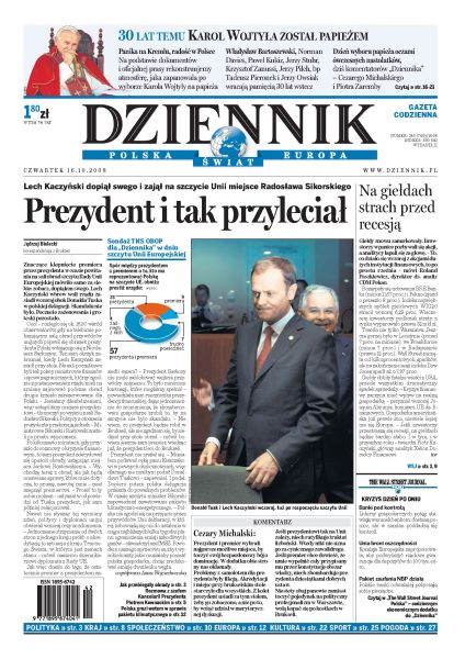 Lech Kaczyński dopiął swego i zajął na szczycie Unii miejsce Radosława Sikorskiego; Grzegorz Kołodko radzi politykom SLD, jak wyjść ze światowego kryzysu; strona Giercownia.pl oferowała dzieciom zabawę w rozrywanie człowieka na strzępy; kłopoty z kredytami hipotecznymi doprowadzą do boomu na rynku wynajmu mieszkań; Wielka Brytania, Niemcy i Francja nawołują do stworzenia systemu wczesnego ostrzegania, który pozwoli uniknąć kolejnego kryzysu finansowego; 30. rocznica początku pontyfikatu Jana Pawła II; Wojciech Kuczok wyjaśnia, jak napisać dobrą powieść; Polska przegrała ze Słowacją 2:1.