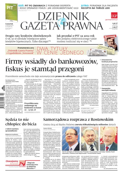 Firmy wsiadły do bankowozów, fiskus je stamtąd przegoni – przerobienie samochodu nie daje automatycznie prawa do odliczenia całego VAT; drogie raty kredytów złotówkowych; jak przesłać e-PIT za 2012 rok; sędzie to nie chłopiec do bicia – 7 reform wymiaru sprawiedliwości; samorządowa rozprawa z Rostowskim – gminy chcą od Skarbu Państwa zwrotu kilkudziesięciu milionów złotych; energetyka oszczędzi miliardy; internetowa koalicja propiracka.