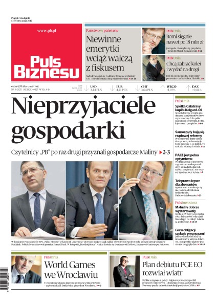 Nieprzyjaciele gospodarki – czytelnicy „PB” po raz drugi przyznali gospodarcze Maliny; World Games we Wrocławiu – wg Rafała Dutkiewicza będzie to największa impreza sportowa w historii Polski; plan debiutu PGE EO rozwiał wiatr; niewinne emerytki wciąż walczą z fiskusem; Bomi sięgnie nawet po 18 mln zł; spółka Calatravy kupiła Kolgard-Oil; samorządy boją się rządowej reformy; PAIIZ jest pełna optymizmu; teleprawo lepsze dla abonentów; Maluchy dobrze wystartowały; guru obligacji szokuje prognozami.