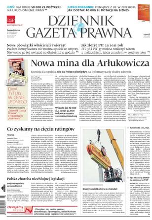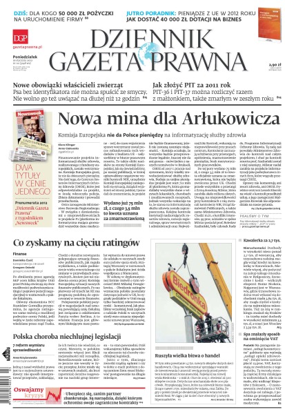 Nowa mina dla Arłukowicza – Komisja Europejska nie da Polsce pieniędzy na informatyzację służby zdrowia; dla kogo 50 tysięcy złotych pożyczki na uruchomienie firmy; nowe obowiązki właścicieli zwierząt; jak złożyć PIT za 2011 rok; co zyskamy na cięciu ratingów; polska choroba niechlujnej legislacji; ruszyła wielka bitwa o handel; spa znalazły sposób na ominięcie VAT; ubezpiecz się, zanim partner zbankrutuje.