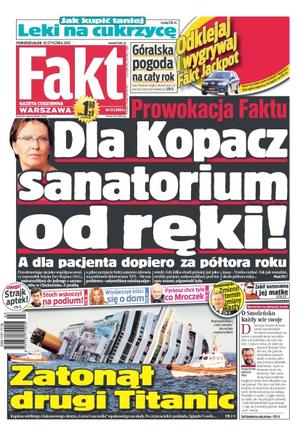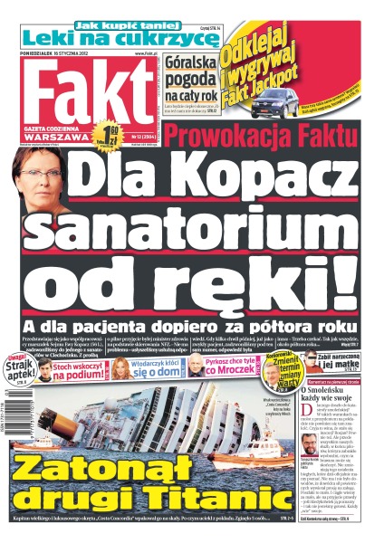 Prowokacja Faktu – dla Ewy Kopacz sanatorium od ręki – a dla pacjenta dopiero za półtora roku; Kamil Stoch wskoczył na podium; Agnieszka Włodarczyk kłóci się o dom; Witold Pyrkosz chce tyle co Mroczek; Bronisław Komorowski zmienił termin zmiany warty; jak kupić taniej leki na cukrzycę; góralska pogoda na cały rok; zatonął drugi Titanic – kapitan wielkiego i luksusowego okretu „Costa Concordia” wpakował go na skały.