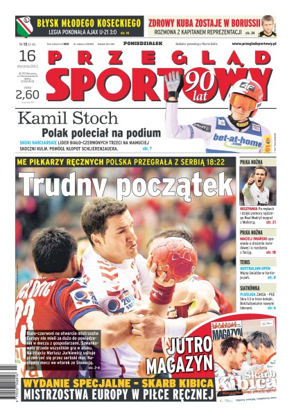 Trudny początek – ME piłkarzy ręcznych Polska przegrała z Serbią 18-22; błysk młodego Koseckiego – Legia pokonała Ajax U-21 3-0; zdrowy Kuba zostaje w Borussii – rozmowa z kapitanem reprezentacji; Kamil Stoch – Polak poleciał na podium; Real Madryt po mękach i dzięki pomocy sędziego Real Madryt pokonał Mallorcę; Maciej Wański opowiada o drużynie narodowej i o rozstaniu z Turcją; wojna światów w turnieju pań Australian Open.
