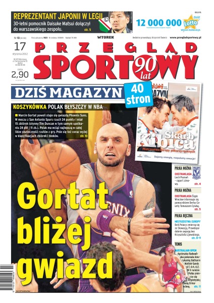 Gortat bliżej gwiazd – Polak błyszczy w NBA, powoli staje się gwiazdą Phoenix Suns – w meczu z San Antoniu Spurs rzucił 24 punkty i miał 15 zbiórek; reprezentant Japonii w Legii – 30-letni pomocnik Daisuke Matsui dołączył do warszawskiego zespołu; Lech Poznań – raport zimowy; Śląsk Wrocław interesuje się pomocnikiem Derby County Tomaszem Cywką; dziś Polacy zmierzą się ze Słowacją w meczu piłki ręcznej – najprawdopodobniej zagrają bez Krzysztofa Lijewskiego; Agnieszka Radwańska pokonała Amerykankę Bethanie Mattek-Sands.