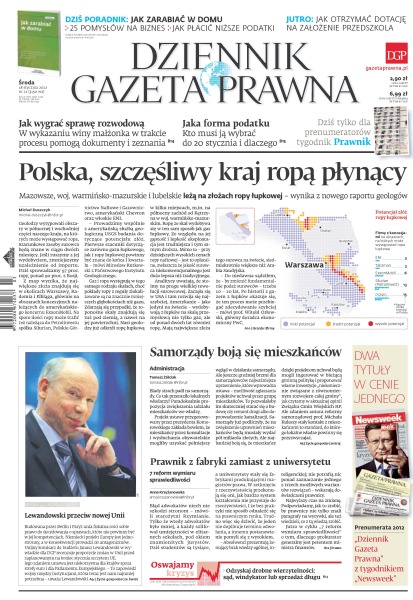 Polska, szczęśliwy kraj ropą płynący – Mazowsze, województwo warmińsko-mazurskie i lubelskie leżą na złożach ropy łupkowej; jak wygrać sprawę rozwodową – w wykazaniu winy małżonka w trakcie procesu pomogą dokumenty i zeznania; jaka forma podatku – kto musi ją wybrać do 20 stycznia i dlaczego; samorządy boją się mieszkańców; prawnik z fabryki zamiast z uniwersytetu; Janusz Lewandowski przeciw nowej Unii; odzyskaj drobne wierzytelności – sąd, windykator lub sprzedaż długu.