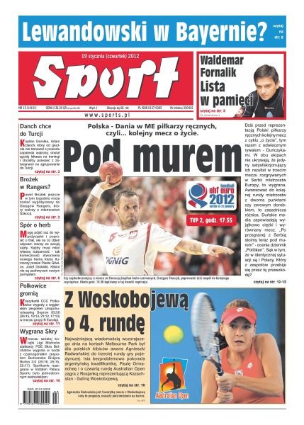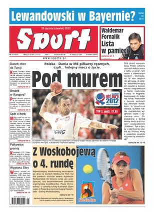 Mecz Polska - Dania w ME piłkarzy ręcznych, czyli... kolejny mecz o życie; Waldemar Fornalik i jego lista w pamięci; Lewandowski ma szansę być wykupionym przez Bayern; Adam Danch - kapitan Górnika Zabrze - chce jechać na zgrupowanie do Turcji; Paweł Brożek jeszcze w tym tygodniu może zostać wypożyczony do Glasgow Rangers; spór o herb – Piast Gliwice, a zwłaszcza jego prezes tłumaczy konieczność stworzenia nowego herbu klubu – kibice nie są zachwyceni nowym pomysłem; koszykarki CCC Polkowice wygrały z węgierskim zespołem Uniqa-Euroleasing Sopron w meczu grup B Euroligi; Agnieszka Radwańska zagra z Galiną Woskobojewą o 4 rundę Australian Open.