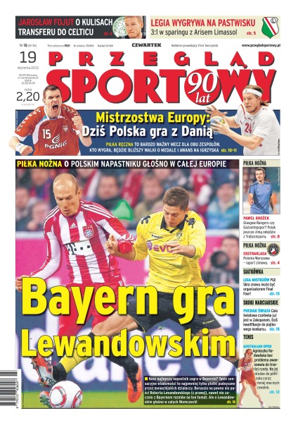 Bayern gra Lewandowskim – o polskim napastniku głośno w całej Europie; mistrzostwa Europy w piłce ręcznej – dziś mecz Polska - Dania; Legia Warszawa wygrywa na pastwisku – 3-1 w sparingu z Arisem Limassol; Jarosław Fojut o kulisach transferu do Celticu; Paweł Brożek jeszcze zimą odejdzie do Glasgow Rangers lub Gaziantepsporu; PGE Skra znowu może być organizatorem Final Four; Cała światowa czołówka jest już w Zakopanem – dziś kwalifikacje do piątkowego konkursu skoków narciarskich; Agnieszka Radwańska bez problemu awansowała do trzeciej rundy Australian Open.