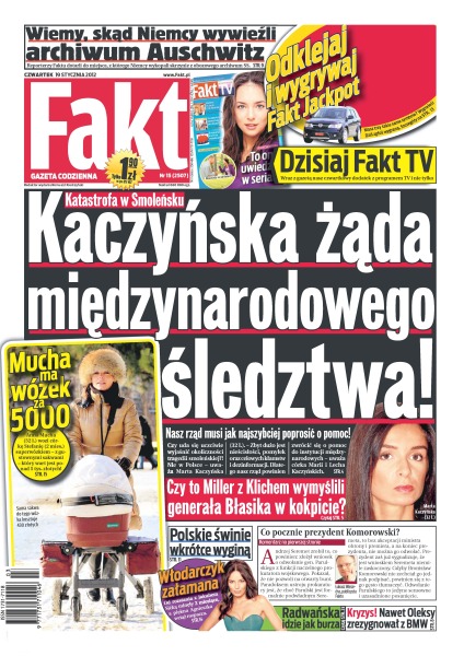 Katastrofa Smoleńska – Marta Kaczyńska żąda międzynarodowego śledztwa – nasz rząd musi jak najszybciej poprosić o pomoc; Anna Mucha ma wózek za 5000; Agnieszka Włodarczyk jest załamana po rozstaniu; kryzys – nawet Józef Oleksy zrezygnował z BMW; reporterzy Faktu dowiedzieli się skąd Niemcy wywieźli archiwum Auschwitz; Agnieszka Radwańska idzie jak burza; polskie świnie wkrótce wyginą.