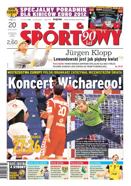 Koncert Wicharego – mistrzostwa Europy – polski bramkarz zatrzymał wicemistrzów świata; „Lewandowski jest jak piękny kwiat” – Juergen Klopp; dziesięciu Polaków wystąpi w dzisiejszym konkursie w Zakopanem; Śląsk Wrocław nie zapłacił jeszcze swoim piłkarzom premii za wicemistrzostwo Polski; Michał Kucharczyk opowiada o tym jak został brutalnie sprowadzony na ziemię; PGE Skra Bełchatów została organizatorem Final Four LM siatkarzy.