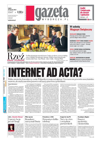 Internet ad acta – polska, niemiecka, francuska czy czeska Wikipedia też mogą zastrajkować – tym razem nie przeciwko amerykańskim ustawom, ale międzynarodowej umowie walczącej z piractwem i podróbkami; zasiłki i świadczenia dla chorych i opiekunów; bramkarz polskiej reprezentacji piłki ręcznej zatrzymał Danię; prawybory w USA – dzwonią w kółko telefony; nici z in vitro i związków partnerskich – czego boi się PO; emeryt ma kredyt i komornika – w pułapce długów.