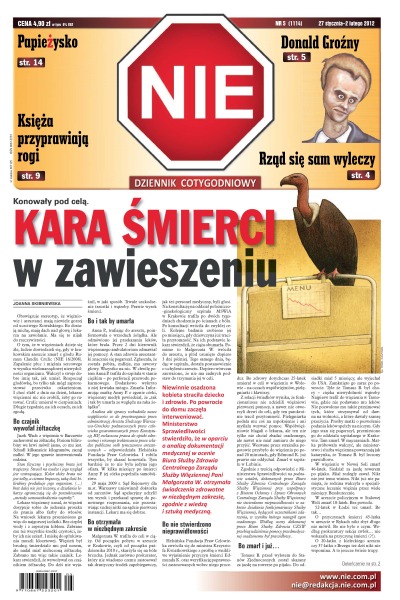 Niewinnie osadzona kobieta straciła dziecko i zdrowie; „NIE” broni ks. Natanka przed episkopatem; ACTA stanowi zagrożenie dla producentów tanich leków; dlaczego obrzydliwie bogaci chcą być jeszcze bogatsi; pokolenie mydełka FA; sławę Nergala stworzyli polscy biskupi; dlaczego prezydent Stalowej Woli Andrzej Szlęzak wydał zarządzenie, by odłączyć od miejskiego prądu oświetlenie kościołów i pomników; Polacy, którzy przez ostatnie 10 lat masowo wyjeżdżali z kraju, stanowią dziś w wielu krajach europejskich największe grupy mniejszościowe.