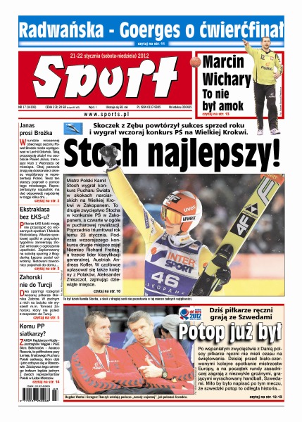 Kamil Stoch powtórzył swój sukces sprzed roku i wygrał zawody Pucharu Świata na Wielkiej Krokwi w Zakopanem; Paweł Brożek może zarabiać 70 tys. zł miesięcznie, jeśli przejdzie do Lechii Gdańsk; na wtorek zapowiedziano ogłoszenie upadłości ŁKS-u; Śląsk Wrocław jest winien 2,2 mln zł swoim piłkarzom, a 3,8 mln zł miastu za dzierżawę działki obok stadionu; Matko Perdijić będzie walczył o powrót do podstawowego składu Ruchu Chorzów; Agnieszka Radwańska gładko awansowała do czwartej rundy Australian Open; dziś polscy piłkarze ręczni zagrają ze Szwecją.