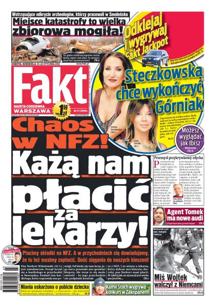 Ryszard Bugaj uważa, że polska służba zdrowia jest niekonstytucyjna; NFZ nie podpisał umów z wieloma przychodniami – pacjenci muszą więc płacić za leczenie; agent Tomek zajechał pod Sejm swoim nowym audi za 100 tys. złotych; archeolodzy pracujący w Smoleńsku uważają miejsce katastrofy za zbiorową mogiłę pełną szczątków ofiar; posłowie oszczędzają w kryzysie – na przykład nie kupią dzieciom mieszkania w Warszawie; gangsterskie porachunki i już druga bomba pod autem w Komornikach pod Poznaniem; młoda Mołdawianka broni kapitana Costy Concordii przed zarzutami; ile trzeba wydać na studniówkę, Justyna Steczkowska chce wygrać wojnę o słuchaczy z Edytą Górniak; Kamil Stoch królem Zakopanego.