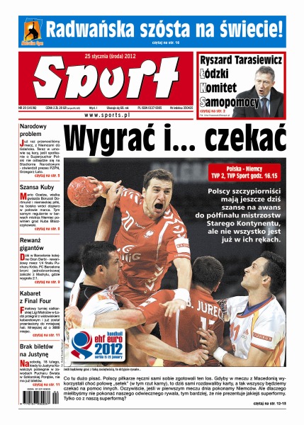 Będą kary, jeśli spotkanie o Superpuchar Polski nie odbędzie się na Stadionie Narodowym; Agnieszka Radwańska jest szósta w rankingu tenisistek na świecie; polscy piłkarze ręczni mają jeszcze dziś szanse na awans do półfinału mistrzostw Europy; nie ma już biletów na 18 lutego, kiedy to Justyna Kowalczyk pobiegnie w zawodach Pucharu Świata w Szklarskiej Porębie.