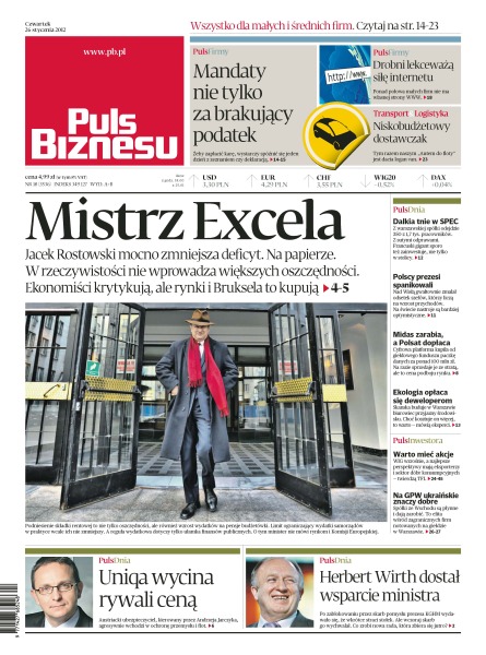 Żeby zapłacić karę, wystarczy spóźnić się na jeden dzień z zeznaniem czy deklaracją; ponad połowa małych firm nie ma własnej strony WWW; minister finansów Jacek Rostowski mocno zmniejsza deficyt, ale tylko na papierze, w rzeczywistości nie wprowadza większych oszczędności; Skanska buduje w Warszawie biurowiec przyjazny środowisku; po fali spekulacji o odwołaniu Herberta Wirtha, prezesa KGHM, skarb zaskoczył jego poparciem.