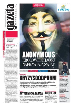 Spis powszechny pokazał, że Polacy przenoszą się z miast na przedmieścia; polskie prawo autorskie już od dawna jest surowsze niż ACTA; polski PKB wzrósł w zeszłym roku o 4,3 procent; przewidywania nowej prezes Urzędu Komunikacji Elektronicznej Magdaleny Gaj; raport dla Bundestagu: co piąty Niemiec jest ukrytym antysemitą; Telewizja Polska bezpłatnie udostępnia tysiąc archiwalnych nagrań; hakerzy z grupy Anonimowi chcą naprawić świat; czym jest kolęda: zbiórką kopert czy spotkaniem duchowym.