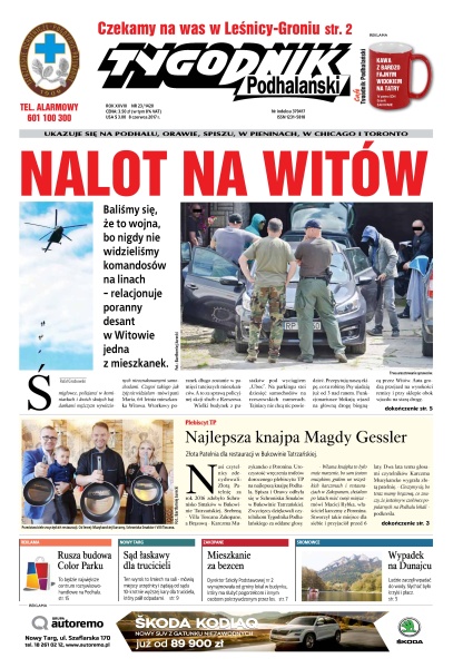 Baliśmy się, że to wojna, bo nigdy nie widzieliśmy komandosów na linach - relacjonuje poranny desant w Witowie jedna z mieszkanek; Złota Patelnia dla restauracji w Bukowinie Tatrzańskiej; rusza budowa Color Parku – to będzie największe centrum rozrywkowo-handlowe na Podhalu; ten wyrok to śmiech na sali - mówią miejscy urzędnicy i żądają od sądu 10-krotnie wyższej kary dla truciciela, który palił odpadami; dyrektor Szkoły Podstawowej nr 2 wynajmowała od gminy lokal w budynku, który ma służyć pogorzelcom i innym osobom pokrzywdzonym przez los.