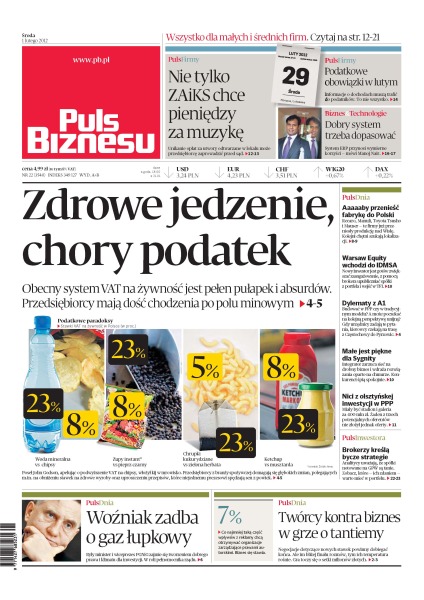 Obecny system VAT na żywność jest pełen pułapek i absurdów, przedsiębiorcy mają dość chodzenia po polu minowym; Recaro, Manuli, Toyota Tsusho i Mauser przeniosły produkcję do Polski; Warsaw Equity Holding chce mieć tyle akcji, ile zarząd IDMSA – podoba mu się Idea TFI; do końca lutego mają czas przedsiębiorcy na przekazanie podatnikom informacji o dochodach, jakie uzyskali w 2011 r.