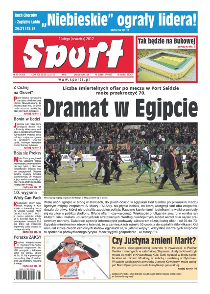 PZPN zapłaci prawie 500 000 zł Zdzisławowi Kręcinie; Justyna Kowalczyk może dziś w Moskwie odrobić część strat do nieobecnej liderki Pucharu Świata w biegach narciarskich, Marit Bjoergen; w meczu siatkówki ZAKSA Kędzierzyn przegrała 1:3 z tureckim Arkanasem Izmir w pierwszym meczu play-off; ponad 70 osób zginęło na stadionie w Port Said po meczu Al-Masry - Al-Ahly.