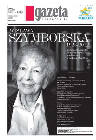 Wisława Szymborska, laureatka Literackiej Nagrody Nobla zmarła w swoim domu, miała 88 lat; od jutra w kinach „Róża” Wojciecha Smarzowskiego; triumfem milionera Mitta Romneya zakończyły się republikańskie prawybory na Florydzie; Dublin chce zrehabilitować obywateli, którzy podczas wojny wbrew zakazom i obowiązującej kraj neutralności zaciągnęli się do brytyjskiej armii, a potem byli za to w Irlandii represjonowani.