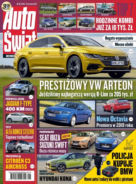 Skoda Octavia, BMW serii 1 i Mercedes klasy A – następne generacje aut kompaktowych; Jaguar F-Type w wersji 400 Sport; Hyundai Kona – prezentacja nowego crossovera; VW Arteon – prestiżowa nowość w palecie Volkswagena; Citroën C3 Aircross – mały SUV na bazie C3; Seat Ibiza kontra Suzuki Swift – porównanie małych aut z silnikami benzynowymi; Alfa Romeo Stelvio – pierwszy SUV Alfy z 210-konnym dieslem; hamulce postojowe – przyczyny awarii i jak sobie z nimi radzić.