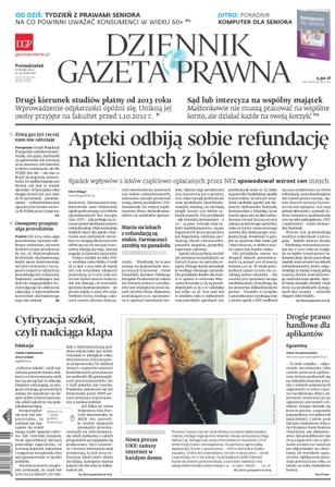 Apteki odbijają sobie refundację na klientach z bólem głowy – spadek wpływów z leków częściowo opłacanych przez NFZ spowodował wzrost cen innych; cyfryzacja szkół, czyli nadciąga klapa; nowa prezes UKE chce wprowadzić tańszy internet w każdym domu; tydzień z prawami seniora – na co powinni uważać konsumenci w wieku 60plus; drogi kierunek studiów płatny od 2013 roku; sąd lub intercyza na wspólny majątek; zimą gaz już raczej nam nie zdrożeje; oswajamy przepisy – ulga prorodzinna; drogie prawo handlowe dla aplikantów.