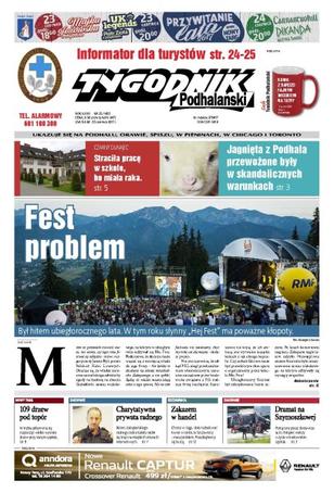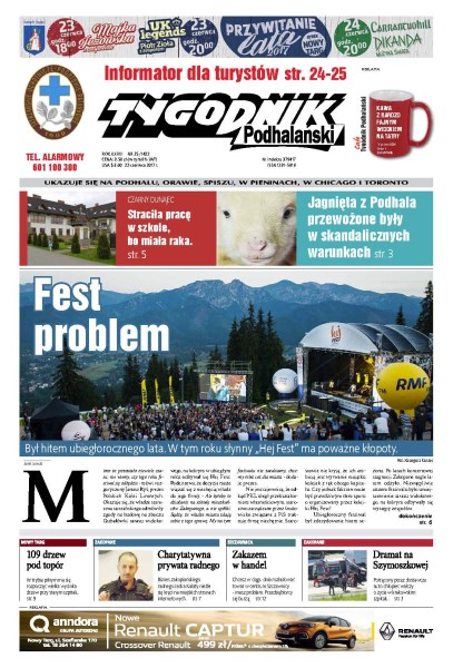 Straciła pracę w szkole, bo miała raka; jagnięta z Podhala przewożone były w skandalicznych warunkach; był hitem ubiegłorocznego lata, w tym roku słynny „Hej Fest” ma poważne kłopoty; w trybie pilnym ma się rozpocząć wielka wycinka drzew przy starym szpitalu; biznes zakopiańskiego radnego Jacka Kalaty nieźle się kręci na miejskich stronach internetowych; chcesz w ciągu dnia rozładować towar w centrum Szczawnicy - masz problem; informator dla turystów.