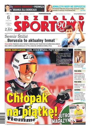 Chłopak na piątkę – Kamil Stoch wygrał piąty konkurs o PŚ; „Borussia to aktualny temat” – Semir Štilić; Justyna Kowalczyk nigdy nie odpuszcza – w niedzielę Polka była druga w biegu łączonym i znowu prowadzi w wyścigu o Kryształową Kulę; pierwsza bramka Ludowica Obraniaka dla Bordeaux; Marcin Gortat zdobył 15 double-double w tym sezonie NBA; dziś lub jutro ostateczna decyzja w sprawie meczu Wisła - Legia na Stadionie Narodowym; Ariel Borysiuk w debiucie dostał czerwoną kartkę; skandal w Rzeszowie – sędziowie popełnili błąd i zakończyli mecz w IV secie przy stanie 24-14 – Resovia wygrała z ZAKS-ą 3-1.