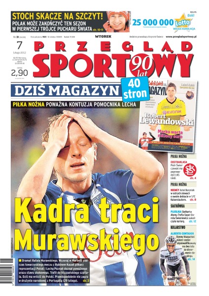 Kadra traci pomocnika Lecha Poznań – dramat Rafała Murawskiego, wczoraj w Marbelli podczas towarzyskiego meczu z Rubinem Kazań piłkarz doznał poważnego urazu stawu skokowego; Kamil Stoch skacze na szczyt – Polak może zakończyć ten sezon w pierwszej trójce Pucharu Świata; Piotr Świerczewski ma poprowadzić ŁKS Łódź; Ariel Borysiuk w ostrych słowach o swoim debiucie w FC Kaiserlautern; Dorota Świeniewicz kończy karierę.