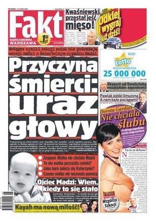 Przyczyna śmierci to uraz głowy – wstępne wyniki sekcji zwłok nie podważają wersji matki o śmiertelnym wypadku Madzi; Bartłomiej Waśniewski, ojciec Madzi, twierdzi, że wie kiedy to się stało; Kayah ma nową miłość Pako Sarra z Senegalu; Dorota Gardias nie chciała ślubu i dlatego rzuciła swojego chłopaka; Waldemar Pawlak jeździ limuzyną, a nam każe pociągami; czy ekspert od Smoleńska to rosyjski agent – służby sprawdzają Edmunda Klicha; Aleksander Kwaśniewski przestał jeść mięso i został wegetarianinem.