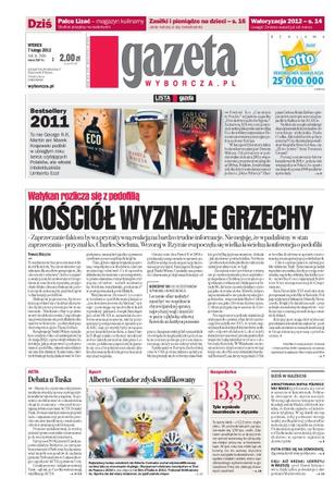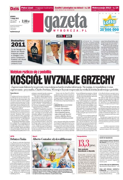 Kościół wyznaje grzechy – Watykan rozlicza się z pedofilią; zasiłki i pieniądze na dzieci – jakie należą ci się świadczenia; waloryzacja 2012 – uwaga – zmiana zasad już od marca; bestsellery 2011 – to nie George R.R. Martin ani Marek Krajewski podbili w ubiegłym roku serca czytających Polaków, ale włoski intelektualista Umberto Eco; debata o ACTA u premiera; Alberto Contador zdyskwalifikowany na dwa lata za stosowanie dopingu; bezrobocie w styczniu wyniosło ponad 13 procent; matka półrocznej Madzi została aresztowana; Władimir Putin stroi się na demokratę.