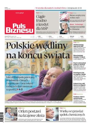 Polskie wędliny na końcu świata – fabryki Konspolu powstaną w Indonezji, Chinach i Argentynie; ciągle trudno o kredyt dla MSP – banki nadal nie wypracowały dobrych metod oceny kondycji najmniejszych przedsiębiorstw; biznes sceptyczny wobec euro – kurczy się odsetek szefów firm, którzy chcą zamiany złotego na euro; rząd rozdał jednak granty po strefach – Ronal, Mando i Capita, choć mają już ulgi w podatkach, dostaną wsparcie na inwestycje w Krakowie i Wałbrzychu; deweloperzy idą na wspólne zakupy; TFI dobrze wystartowały – rekordzista zarobił w styczniu aż 17,8 procenta; Orlen postawi na krajowe złoża; wielka wyprzedaż spółek chemicznych.