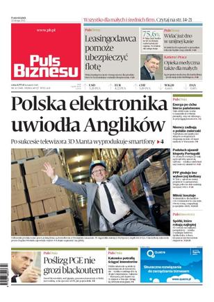 Polska elektronika uwiodła Anglików – po sukcesie telewizora 3D Manta wyprodukuje smartfony; leasingodawca pomoże ubezpieczyć flotę – firma leasingowa może wynegocjować dla przedsiębiorców korzystniejsze warunki ubezpieczenia; widać już dno w unijnej kasie – w niektórych regionach w przyszłym roku nie będzie czego dzielić; Energa po cichu bierze państwowe – małe elektrownie wodne to maszynki do robienia pieniędzy, więc nic dziwnego, że przyciągają inwestorów; Niemcy zadbają o polskie zwierzaki – największa europejska sieć sklepów zoologicznych ekspansję zacznie od supermarketu w Warszawie; podsłuch ujawnił kłopoty Portugalii; walentynki to dla handlowców i restauratorów czas żniw; poślizg PGE nie grozi blackoutem.