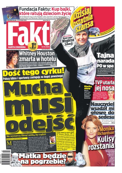 Dość tego cyrku – Mucha musi odejść – polscy kibice i sportowcy zasługują na kogoś poważnego; czy matka Madzi będzie na pogrzebie; Monika Richardson i kulisy jej rozstania z mężem; nauczyciel wsadził mi głowę do sedesu – bulwersujące oskarżenie ucznia kieleckiego gimnazjum; TVP utarła nosa Małgorzacie Kożuchowskiej; tajna narada PO w spa; Whitney Houston zmarła w hotelu – znalazł ją ochroniarz w hotelowej wannie.
