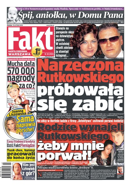 Narzeczona Krzysztofa Rutkowskiego próbowała się zabić – stanęła na parapecie okna na dziewiątym piętrze, w ostatniej chwili zdołano ją stamtąd ściągnąć; megapremia dla nieudolnego dyrektora – Joanna Mucha dała 570 tysięcy złotych nagrody, tylko za co; Joanna Liszowska sama naprawia porsche – radzi sobie jak mężczyzna; Donald Tusk chce byśmy pracowali do końca życia – premier nie rezygnuje z reformy emerytur; kim jest człowiek z gór – odnaleziono go w tatrach; „Rodzice wynajęli Rutkowskiego żeby mnie porwał” – na ulicy w Berlinie ludzie z firmy „detektywa” usiłowali porwać kobietę; dziś o 14 w Sosnowcu pożegnamy małą Madzię.
