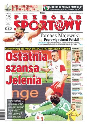 Ostatnia szansa Jelenia – na Portugalię bez Pawła brożka, za to z Ireneuszem Jeleniem; Barcelona pokonała Bayer 1-3, a Ol. Lyon pokonał Apoel 1-0; stadion w Zabrzu zamknięty – zagrożony niedzielny mecz Górnika z Legią; „Poprawię rekord Polski” – Tomasz Majewski o planach na Halowe Mistrzostwa Świata; „Żal jak diabli, że odchodzę z Legii” – Maciej Rybus; Śląsk Wrocław, lider ekstraklasy, dostał zgodę na rozgrywanie meczów bez kibiców gości; Szczęsny na San Siro czyli dziś Arsenal gra z Milanem; Jakub Błaszczykowski o świetnym początku rundy w Borussi Dortmund.