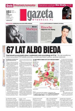 67 lat albo bieda – rząd pokazał wczoraj projekt ustawy o podniesieniu wieku emerytalnego do 67 lat – „Bez tego musielibyśmy drastycznie podnieść VAT i składki emerytalne, a świadczenia obniżyć o połowę” – przekonywał premier; mieszkania komunalne – jak je wykupić, dla kogo ulgi; koszmarna terapia w radomskim szpitalu; czy Portugalia będzie miała kłopoty jak Grecja; mity o telewizji Trwam ojca Rydzyka; naukowcy z USA naprawili serca uszkodzone zawałem – do ich połatania wykorzystali komórki macierzyste pobrane od tych samych pacjentów.