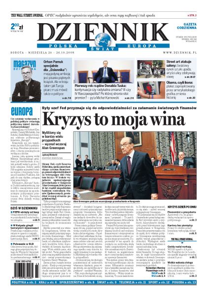 Alan Greenspan, były szef Fed, przyznaje się do odpowiedzialności za załamanie światowych finansów; Lech Kaczyński przypomina, że przestrzegał Polaków przed braniem kredytów w walutach obcych; w SLD wrze po decyzji zarządu partii o zmianie szefa klubu; PZPN nie zapłacił 18,5 mln zł podatku VAT za sprzedaż praw do transmisji meczów ekstraklasy; Polacy ustawiają się w kolejkach do kantorów, by wymienić tracącą na wartości złotówkę na dolary i euro; młodzi ojcowie deklarują, że są w stanie opiekować się dziećmi równie dobrze jak kobiety; tegoroczne wybory prezydenckie w USA mogą okazać się wyjątkowe pod względem frekwencji.