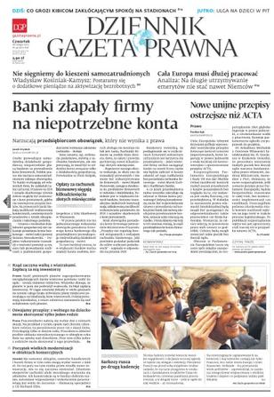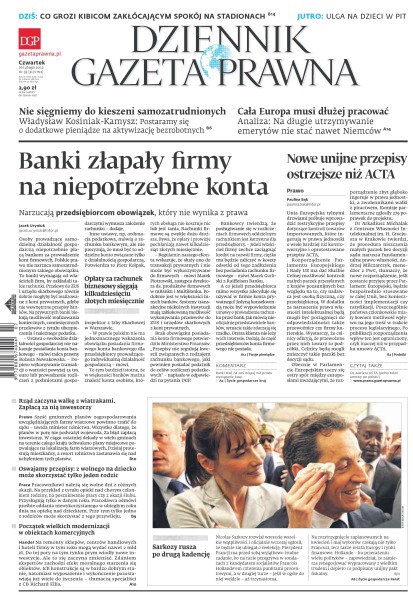 Banki złapały firmy na niepotrzebne konta – narzucają przedsiębiorcom obowiązek, który nie wynika z prawa; nowe unijne przepisy ostrzejsze niż ACTA; co grozi kibicom zakłócającym spokój na stadionach; rząd zaczyna walkę z wiatrakami – zapłacą za nią inwestorzy; oswajamy przepisy – z wolnego na dziecko może skorzystać tylko jeden rodzic; początek wielkich modernizacji w obiektach komercyjnych; Nicolas Sarkozy rusza po drugą kadencję.