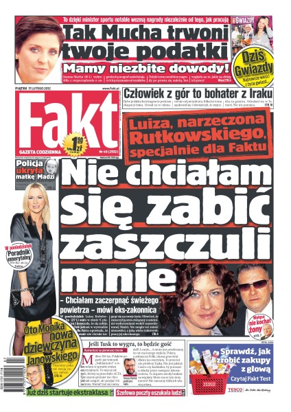 „Nie chciałam się zabić, zaszczuli mnie” – Luiza, narzeczona Rutkowskiego, specjalnie dla Faktu; zobacz jak Joanna Mucha trwoni twoje podatki – mamy niezbite dowody – to dzięki minister sportu notable wezmą nagrody niezależnie od tego, jak pracują; Lech Wałęsa nigdy nie kochał żony; już dziś startuje ekstraklasa; szefowa poczty oszukała ludzi; człowiek z gór to bohater z Iraku; policja ukryła matkę Madzi; Monika, nowa dziewczyna Roberta Janowskiego.