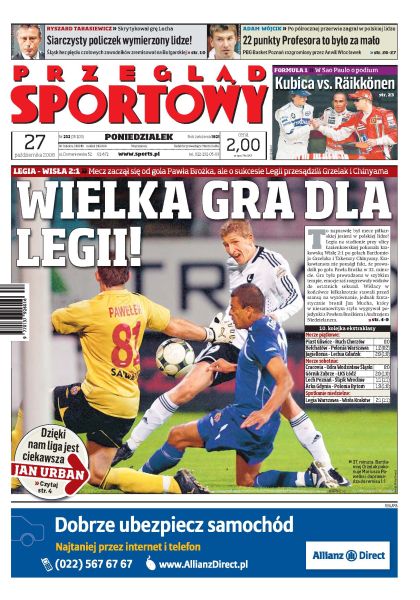 Na Łazienkowskiej Legia pokonała Wisłę 2:1; na czwartkowym zjeździe PZPN szykuje się wielka walka o władzę; Jan Mucha - postać kolejki ekstraklasy; wywiad z Ryszardem Tarasiewiczem, trenerem Śląska Wrocław; Robert Kubica stoczy pojedynek o podium mistrzostw świata; Adam Wójcik po półrocznej przerwie znów zagrał w lidze koszykarskiej, nie przyniosło to jednak wygranej PBG Basket Poznań; dzięki nam liga jest ciekawsza - mówi Jan Urbański; Kathrin Zettel zwyciężyła w inauguracyjnych zawodach slalomu gigant.