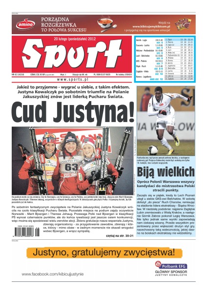 Justyna Kowalczyk znów jest liderką Pucharu Świata w biegach narciarskich; oprócz Polonii Warszawa wszyscy kandydaci do mistrzostwa Polski stracili punkty; Harry Redknap przyznał, że jest gotów poprowadzić reprezentację Anglii podczas finałów ME.