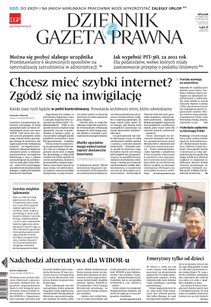 Dostawcy stacjonarnego internetu ostrzegają, że będą gromadzić dane na temat odwiedzanych przez nas stron WWW; powstaje nowy system zbierania informacji o oprocentowaniu bankowych depozytów negocjowanych; miejsc pracy przybywa głównie w mało sfeminizowanym przemyśle; Citibank podniósł prawdopodobieństwo ogłoszenia niewypłacalności Grecji; dotknięty sankcjami Iran nie może znaleźć kupców na swoją ropę.